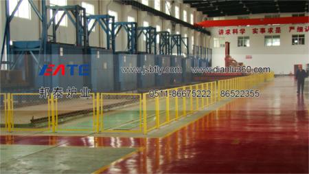 本套淬火機(jī)組有多臺(tái)鐘罩式電阻爐與一臺(tái)淬火操作車(chē)組合為一個(gè)快速淬火機(jī)組生產(chǎn)線(xiàn),一個(gè)機(jī)組可以根據(jù)用戶(hù)的產(chǎn)量和工藝要求配套幾臺(tái)不同的爐型,爐子的數(shù)量和爐型可以自由組合,本生產(chǎn)線(xiàn)可滿(mǎn)足不同的生產(chǎn)工藝如:淬火、回火、退火、調(diào)質(zhì)等熱處理工藝,爐溫有1200℃,950℃,700℃等,每條生產(chǎn)線(xiàn)配有一臺(tái)快速下水淬火操作車(chē),該操作車(chē)可上下、左右、前后六個(gè)方向移動(dòng),工件熱處理完成后,操作車(chē)迅速進(jìn)入爐內(nèi)將工件從爐膛內(nèi)叉出,并快速落入水池或淬火液池內(nèi),整個(gè)過(guò)程在1分鐘內(nèi)完成,生產(chǎn)效率高,操作方便,從而保證了工件的淬火質(zhì)量。