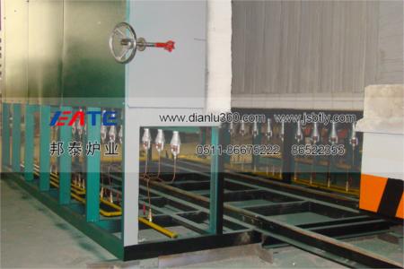 3、臺車骨架由各種大型工字鋼、槽鋼、角鋼及厚鋼板等組合焊接而成。臺車傳動(dòng)采用電動(dòng)機(jī)、蝸輪減速機(jī)組合通過鏈條帶動(dòng)前端主動(dòng)輪傳動(dòng)。臺車耐火砌體采用高鋁定型磚結(jié)構(gòu),與爐體密封效果好,耐壓強(qiáng)度高。臺車與爐體密封采用軟接觸的方法,并在臺車下部設(shè)有迷宮式沙封槽及沙封刀密封裝置。<br>3、爐門采用側(cè)開式,簡單方便,密封采用手輪壓緊機(jī)構(gòu)。